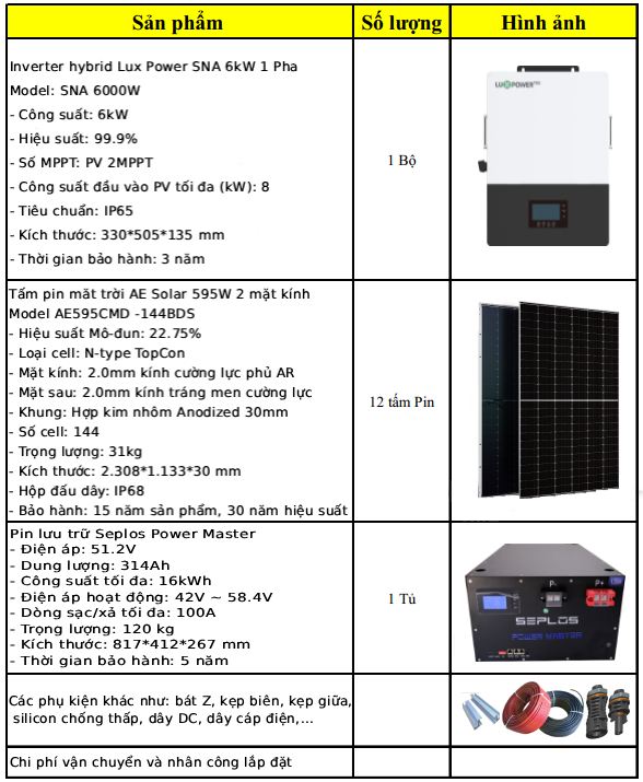 Hệ Thống Điện Mặt Trời 6kW Hybrid LuxPower SNA 1Pha