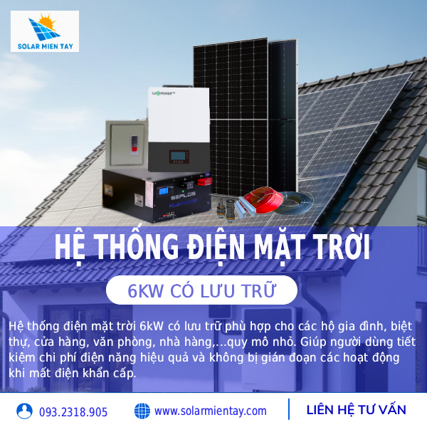 Bạn có biết rằng, một hệ thống điện mặt trời có thể giúp bạn giảm 80-95% hóa đơn tiền điện mỗi tháng? Không chỉ tiết kiệm chi phí điện năng, hệ thống điện mặt trời 6kW Hybrid còn đảm bảo nguồn điện dự phòng ổn định, khi xảy ra tình trạng mất điện khẩn cấp. Hãy cùng Solar Miền Tây chi tiết hệ thống điện năng lượng mặt trời 6kW có lưu trữ này nhé!