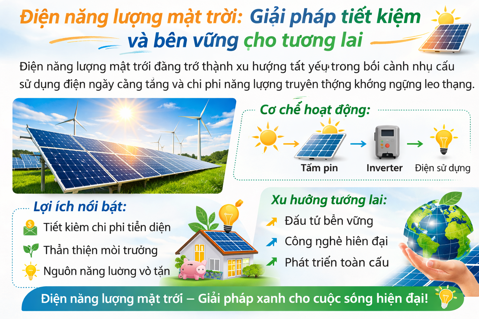 Tương lai năng lượng sạch phụ thuộc vào quyết định của chúng ta hôm nay. Lựa chọn điện mặt trời chính là lựa chọn phát triển bền vững, tiết kiệm lâu dài và trách nhiệm với cộng đồng.